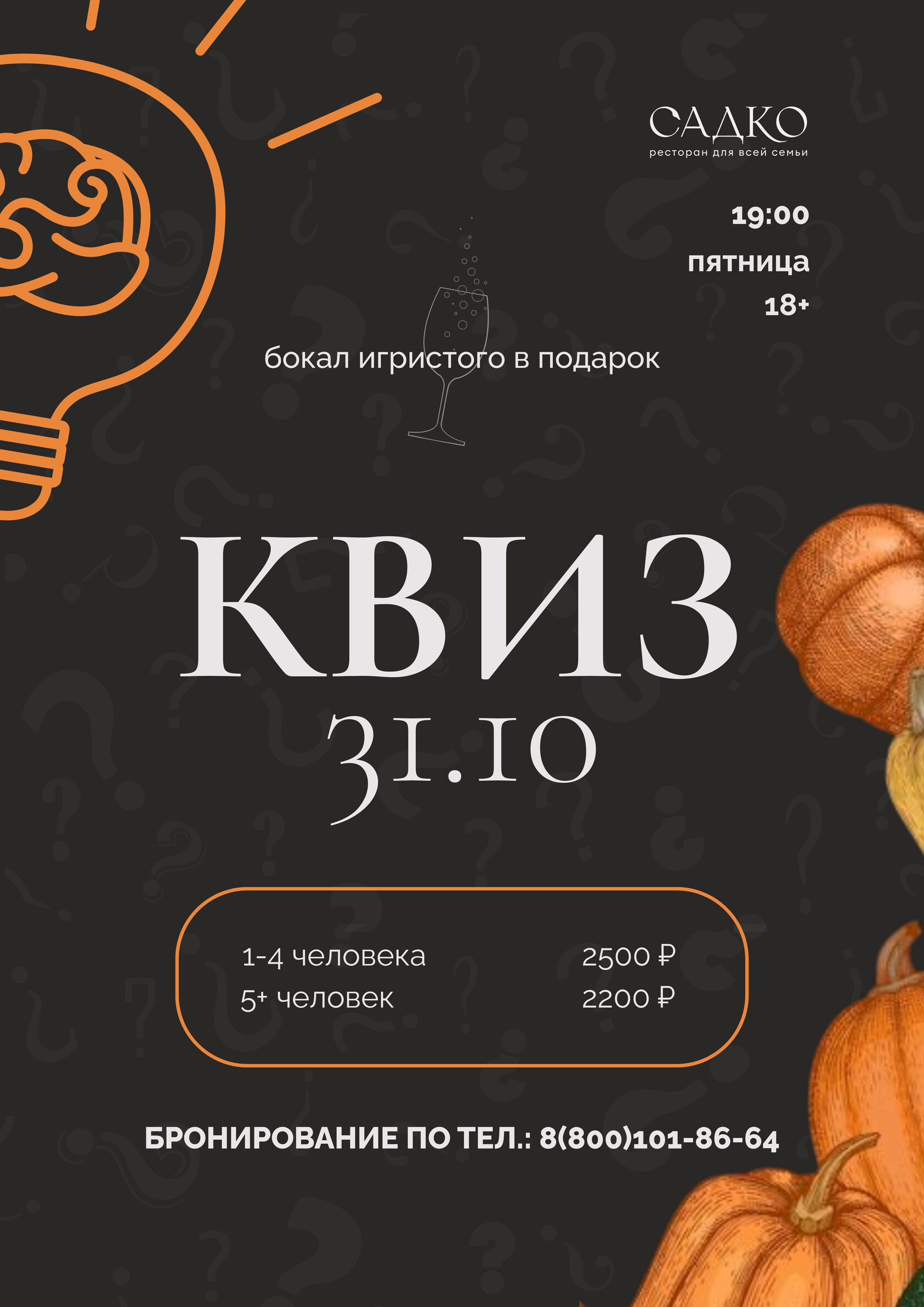 Квиз-вечер в пятницу! 📅 Дата: 31.10 | 🕖 Время: 19:00 | 🔞 Возраст: 18+